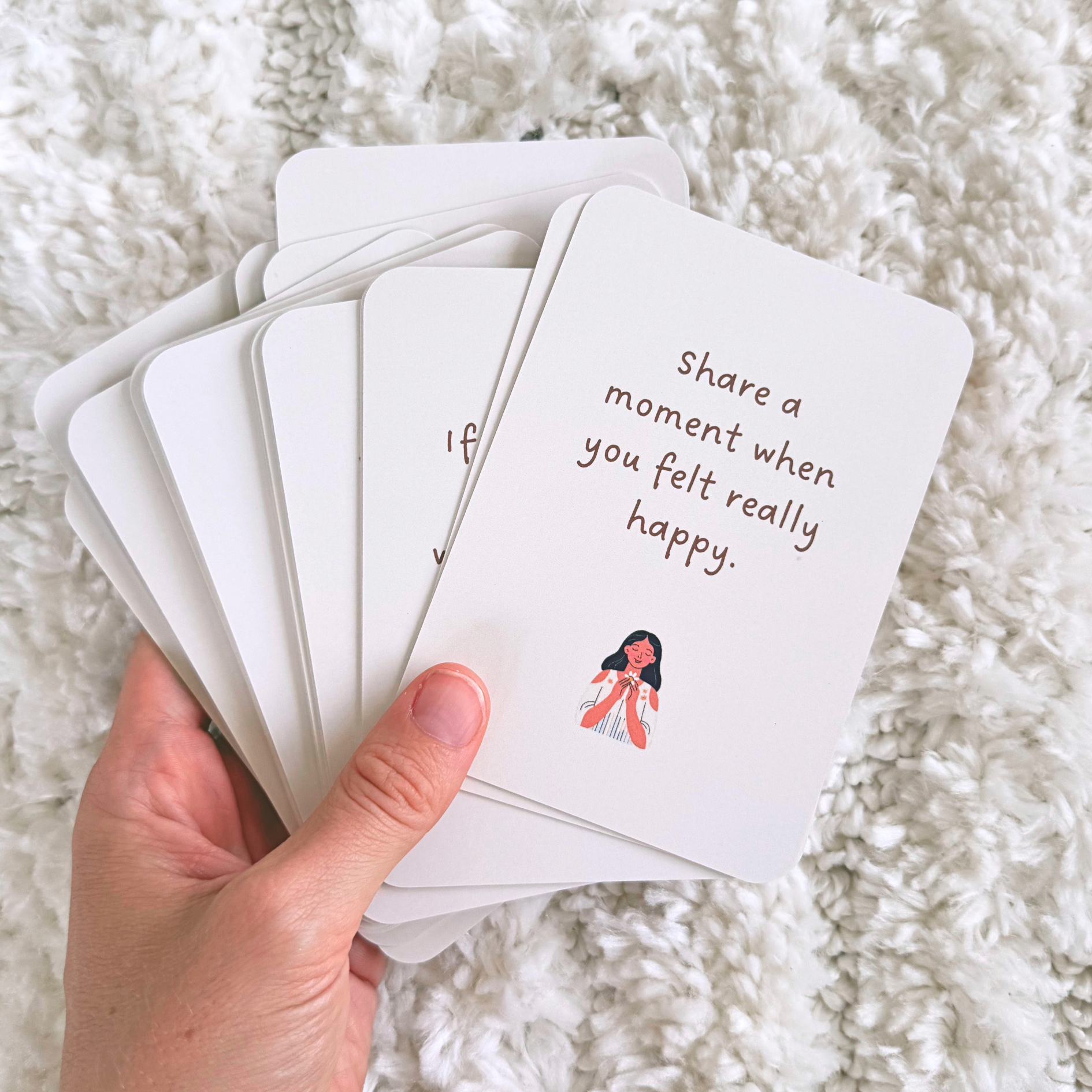 - Premium colour-printed watercolour cards with discussion prompts & follow-up questions