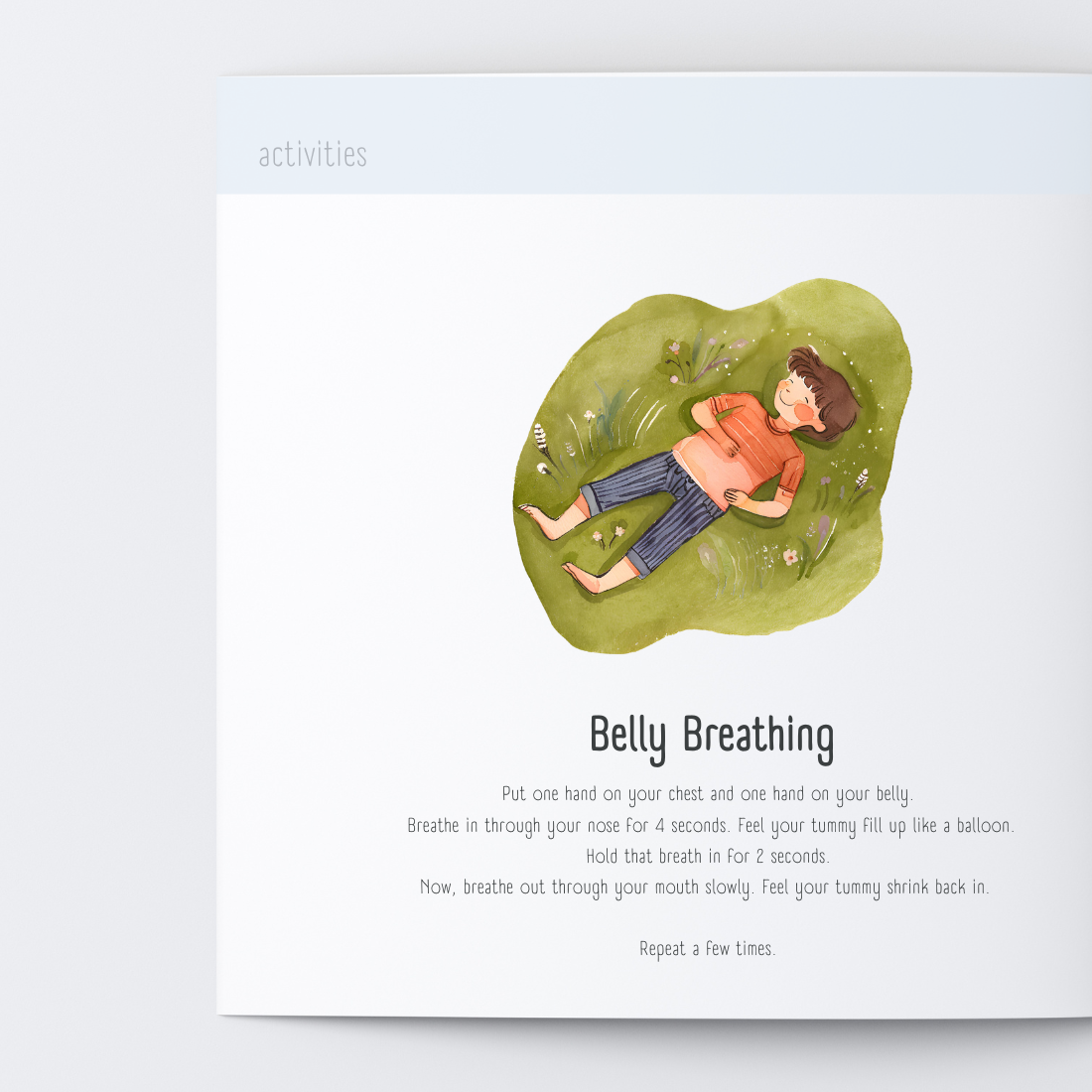 - Guides children through simple strategies, such as belly breathing, 4-4-4 breathing and take five breathing.